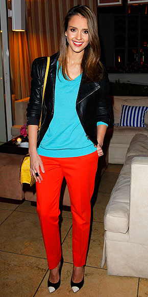 Jessica Alba, color blocking-ja egyszerűen nagyszerű. Ha a munkahelyeden nem kötnek szigorú szabályok, szerintem akkor bátran vállald be, legalább egy kis színt viszel a szürke hétköznapokba, de egy barátokkal eltöltött estére is kiváló választás.